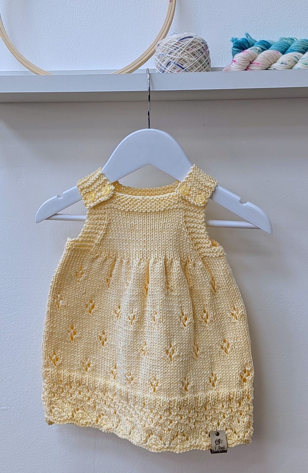 Our beautiful hand-knitted dress is perfect for your little princess! Made with super soft cotton and lovingly crafted by Elaine, this dress is sure to delight.